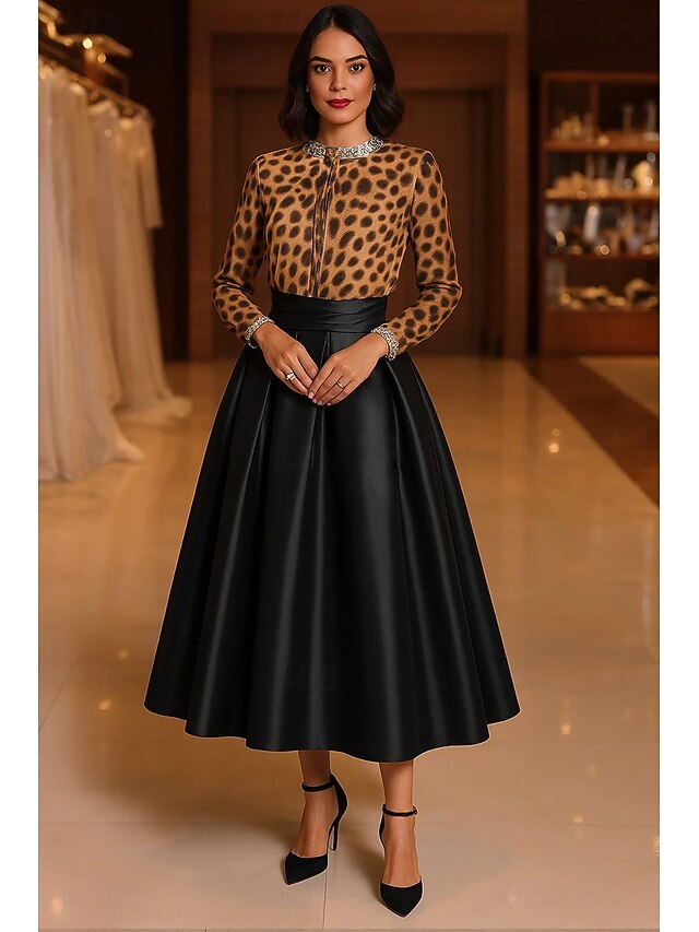 sizzling ! Leopard Print A-Line Cocktail Dresses Elegant Formal Dress Formal Wedding Tea Length Midi Length Long Sleeve Crew Neck Chiffon with Pleats Crystals Embellished 2025