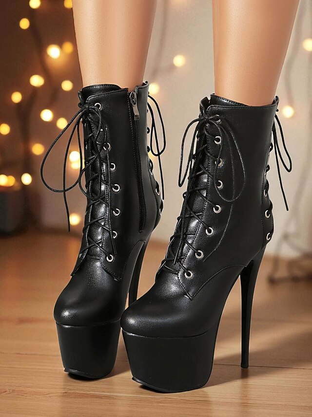 HOT ! Women's Black Faux Leather Lace-Up Platform Ankle Boots - Sexy High Stiletto Heel Short Booties for Nightlife & Pole Dance