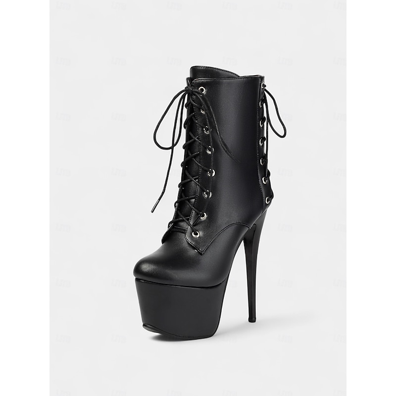 Women's Black Faux Leather Lace-Up Platform Ankle Boots - Sexy High Stiletto Heel Short Booties for Nightlife & Pole Dance 6