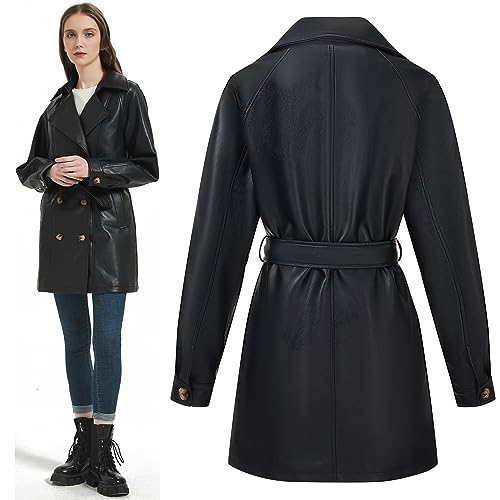 More information about RISISSIDA Women Faux Leather Long Jacket,Double Breasted Spring Fall Pleather Casual Lapel Mid Length Trench Coat with Belt