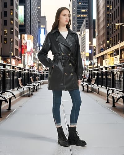 RISISSIDA Women Faux Leather Long Jacket,Double Breasted Spring Fall Pleather Casual Lapel Mid Length Trench Coat with Belt 4
