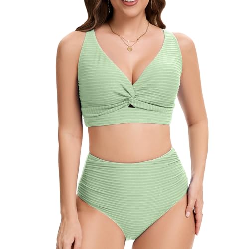 HOT ! Women's High Waist Bikini Set Twist Front Textured Swimsuits Two Piece Bathing Suit Summer Beach Resort Swimwear