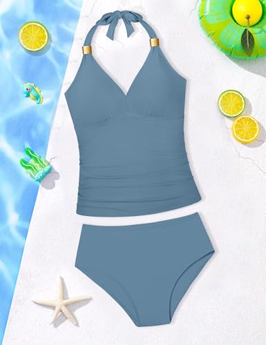 HOT ! NECIOUS Teen Swimsuits for Girls 12-14 Two Piece Teen Bathing Suits Girls Tankini Set Blue Halterneck Ruched Cute V-Neck Swimwear