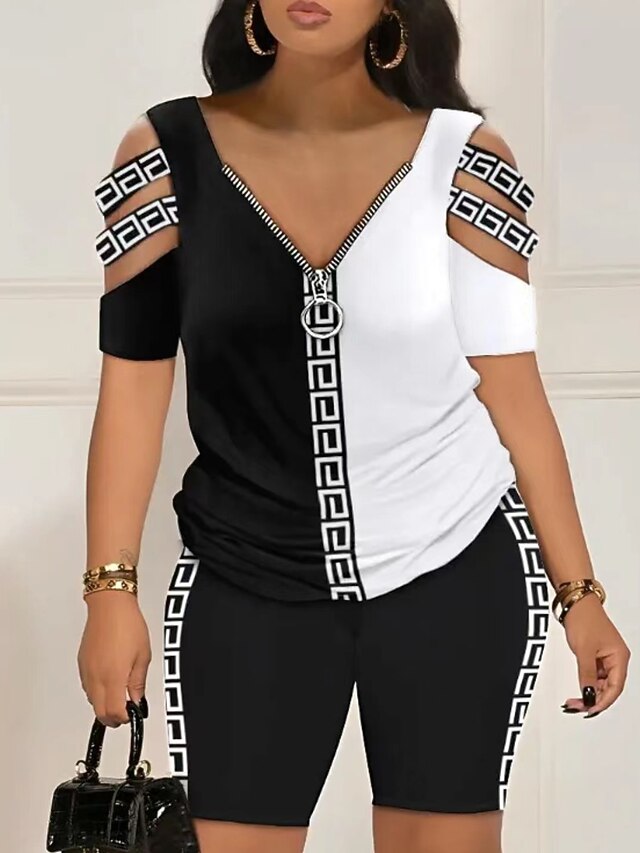 HOT ! Women's Shirt Shorts Sets Graphic Zipper Cut Out Casual Daily Fashion Short Sleeve V Neck Black Summer
