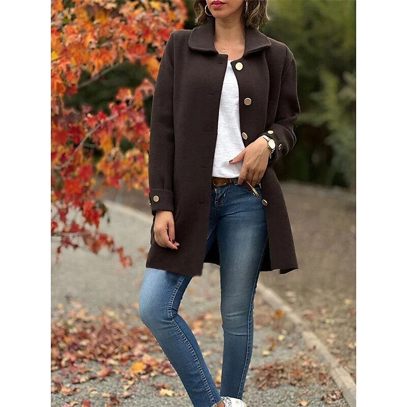 Highlights [Fabric:] Crafted from premium polyester, this women's coat offers a warm and breathable experience perfect for chilly fall and winter days. The micro-elastic nature of the material ensures a comfortable fit, providing both style and functionality. [Fit Style:] Designed as a regular fit, this coat elegantly shapes the body with its tailored structure. The coat features a classic turndown neckline and a single-breasted placket, creating a sophisticated and timeless appearance. [Design Highlights:] The coat boasts a wide, decorative collar that exudes elegance, while practical side pockets enhance functionality. Large, round buttons on the front add a touch of classic charm, and buttoned cuffs on the long sleeves offer a polished finish. [Occasions:] Perfect for daily wear, street style, and outdoor activities, this versatile coat is a stylish choice for various casual outings. Whether you're strolling through the city streets or enjoying a leisurely weekend, it provides both warmth and charm. [Size Range:] Available in a range of sizes from S to 2XL, ensuring a suitable fit for diverse body types. The coat comes in three chic colors: Black, Apricot, and Coffee, allowing you to choose the perfect shade for your wardrobe.