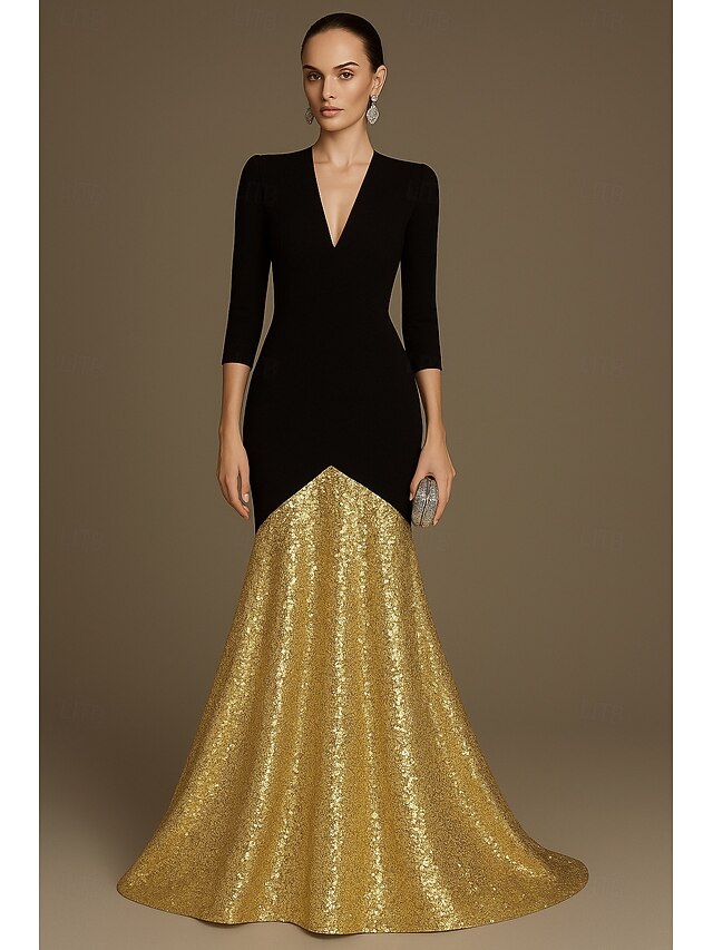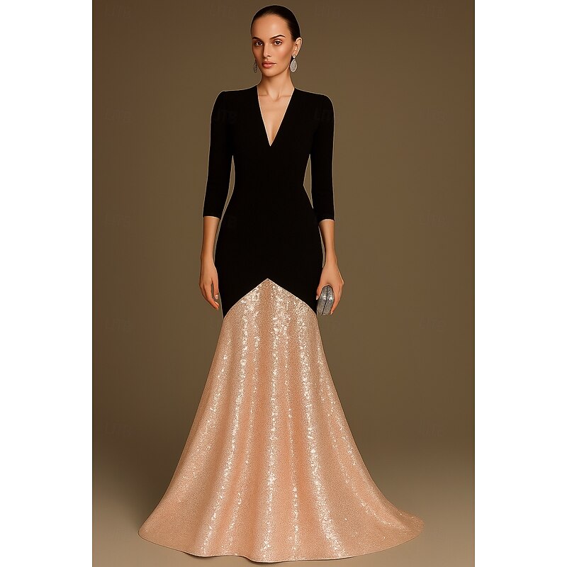 Why Choose Black Gold Silver Sequined Mermaid Evening Gown Elegant Dress Formal Wedding Floor Length 3/4 Length Sleeve V Neck with Pleats 2025?