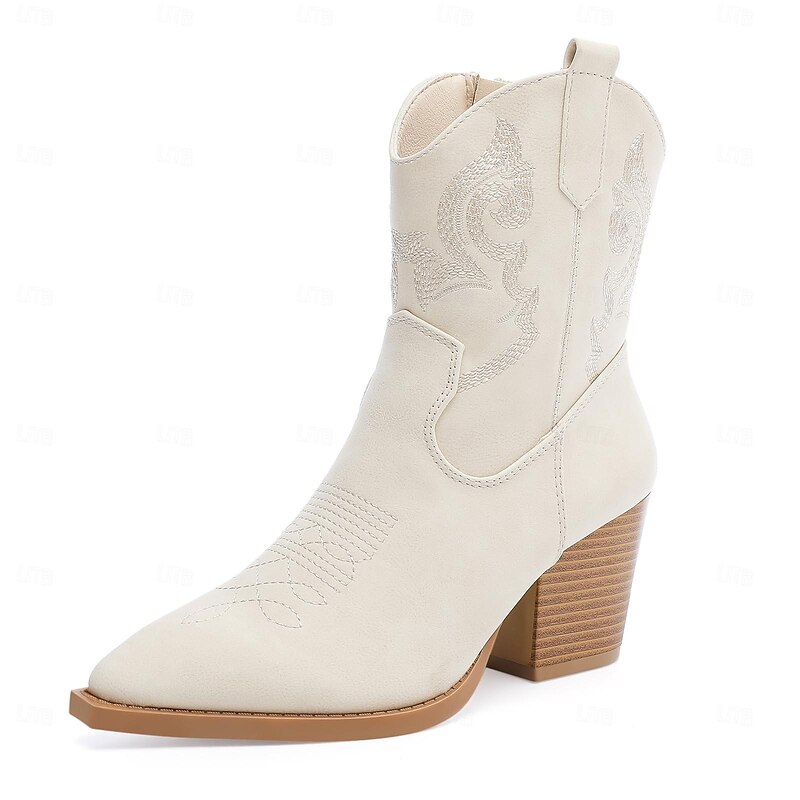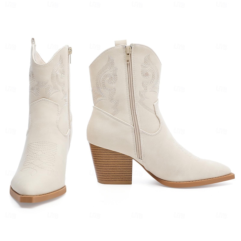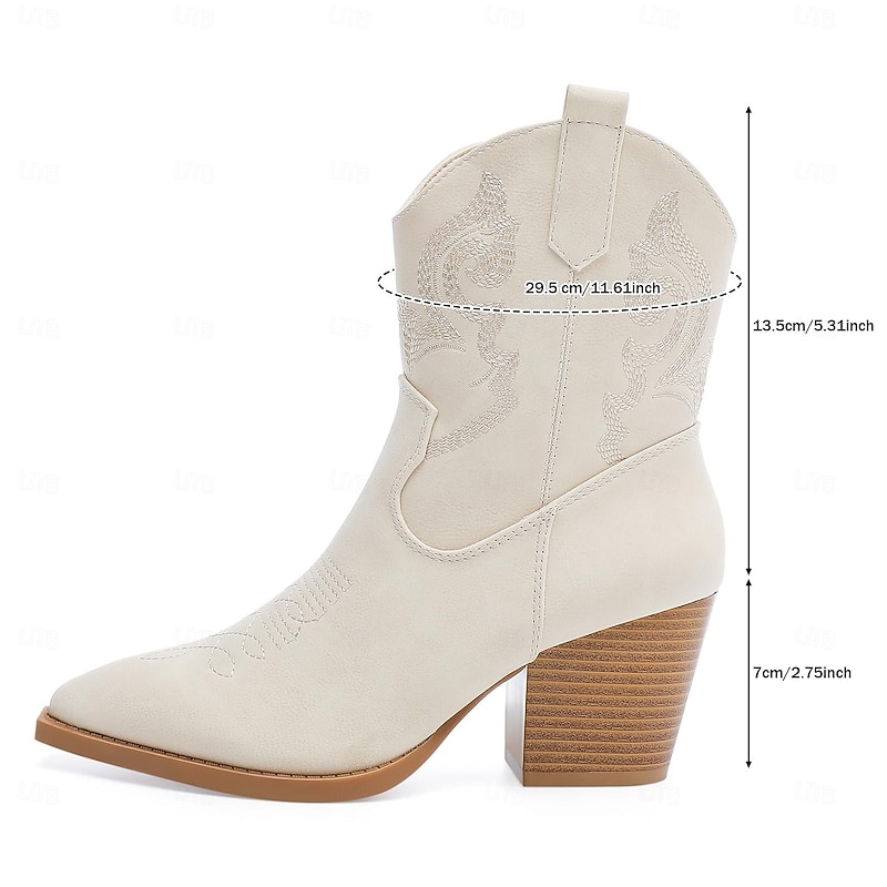 Highlights [Fabric] Crafted from high-quality PU, these women's boots offer both durability and style. The soft faux leather in off-white provides a sleek and modern look, ensuring comfort throughout wear. [Silhouette] Featuring a classic Western-inspired design, these boots showcase a vintage style with a pointed toe. The sturdy chunky heel offers mid-height elevation, making them perfect for various occasions. [Design Highlights] The boots are adorned with intricate embroidered patterns, adding an elegant touch to their overall aesthetic. Side zippers and convenient pull tabs ensure easy wear, while the durable rubber sole provides excellent grip and longevity. [Occasions] Ideal for vacations, daily wear, work, and outdoor activities, these boots effortlessly blend chic Western flair with functionality. They suit both casual and semi-formal events, making them a versatile addition to any wardrobe. [Size Range] Available in a variety of sizes, from US6 to US9.5-10, please refer to the size chart to ensure the perfect fit.