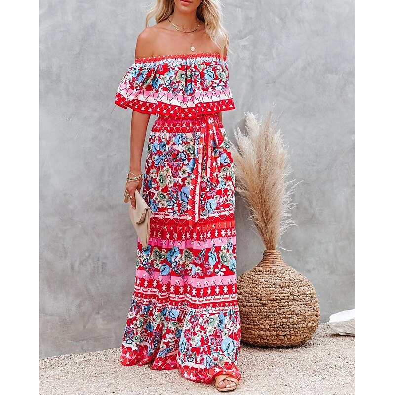 HOT ! Mexican Dress for Women Off-Shoulder Ruffle Floral Print Summer Party Casual Maxi Dresses Ladies Beach Sundress