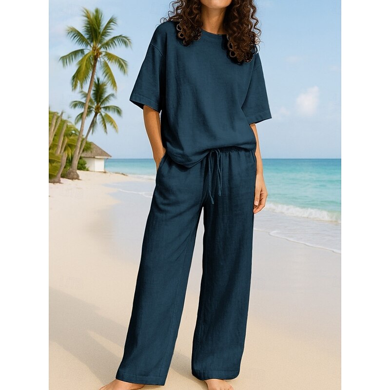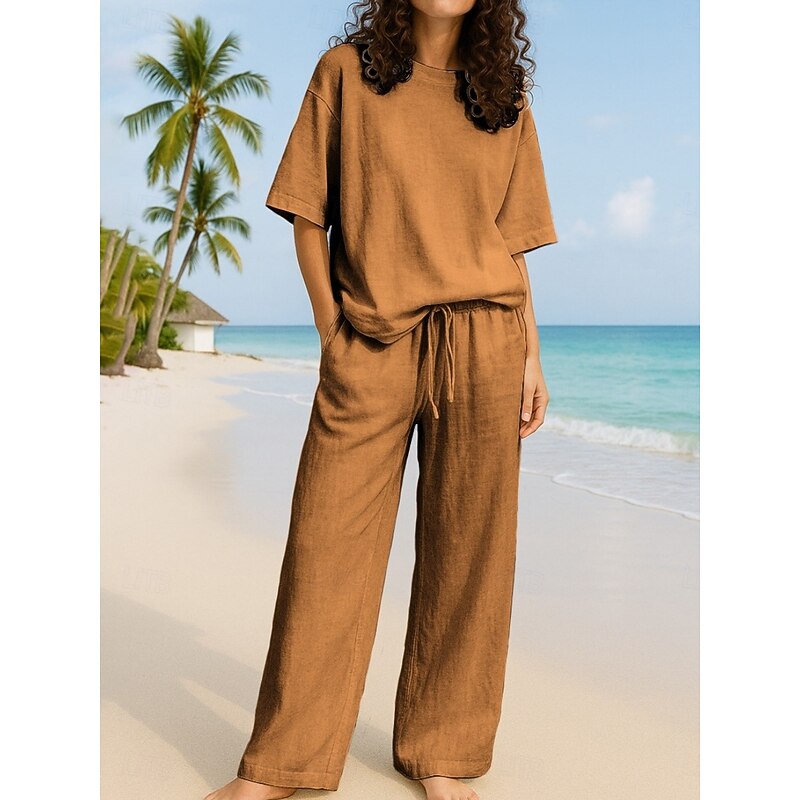 HOT ! Women's Active Basic Two Piece Sets Pants Sets Half Sleeve Crew Neck Solid Color Casual Daily Navy Blue Brown Green Summer Regular Fit