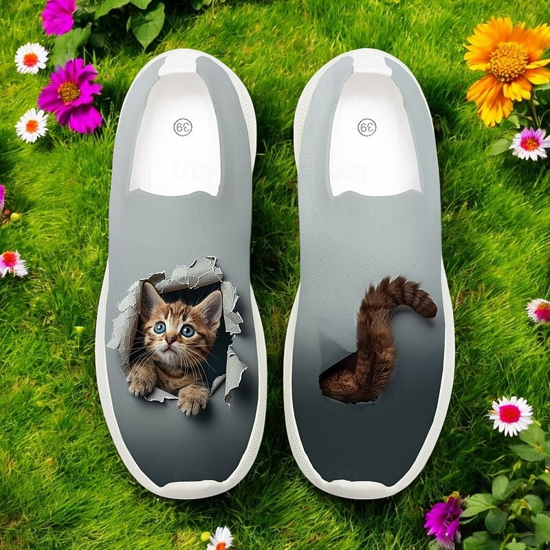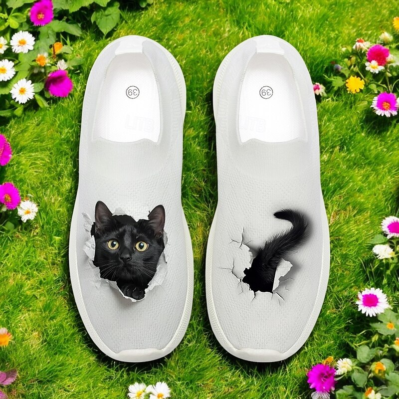 HOT ! Slip-On Flyknit Sneakers with Cat Print Design, Breathable Upper and Comfortable Sole for Casual and Fun Wear