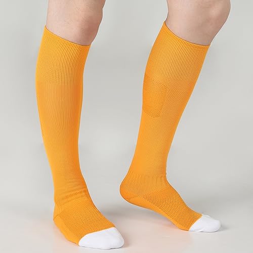 • Ankle support & over the calf design: The Unisex Football Socks with knee high length would help to reduce skin pressure and offer extra comfort. Stretchy top cuffs and elastic band of ankle and arch make the socks stay comfortably on calves with no falling off. These football socks feature targeted cushioning on the instep for shock absorption, while heel and ankle compression keep the socks in place to give you better comfortable and keep shin guards secure.