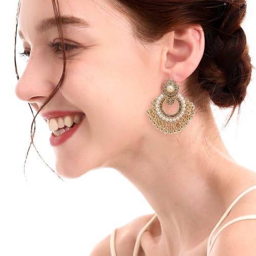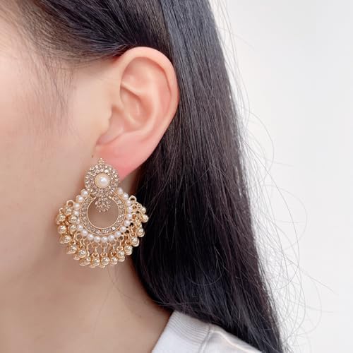 HOT ! Vintage Round CZ Pearl Beaded Tassel Statement Dangle Drop Earrings for Women Gold Plated Boho Crstyal Beaded Chandelier Dangling Stud Indian Jhumka Festival Jewelry for Her