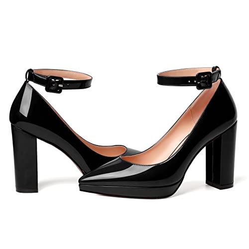 More information about MERRORI Womens Platform Evening Dress Buckle Solid Patent Pointed Toe Ankle Strap Chunky High Heel Pumps Shoes 4 Inch