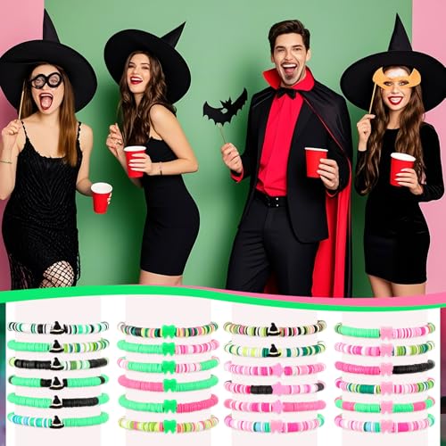 24 Pcs Witch Party Favors Witch Friendship Matching Bracelets Bulk Pink and Green Party Supplies Wizard Hat Princess Clay Beaded Bracelets Accessories for Movie Fans Birthday Woman Gifts 1