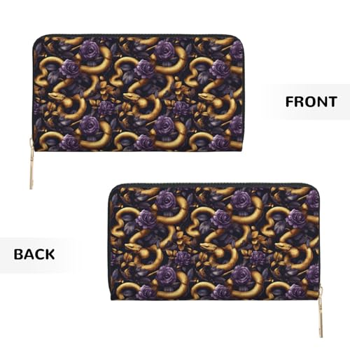 Leather Thin Slim Wallets for Women & Men - Golden Snake Purple Rose Print Card Wallet Holder with Zipper 1