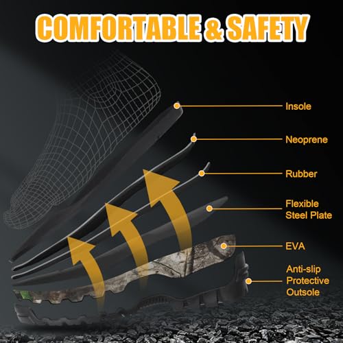 • 👣👣Cushioning & Shock Absorption: EVA midsole ensures lightweight cushioning, shock absorption, and comfort. Whether working, hunting, fishing, camping, etc. Keep you dry and warm, handling the toughest situations, also great work boots and rain boots