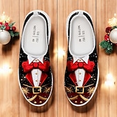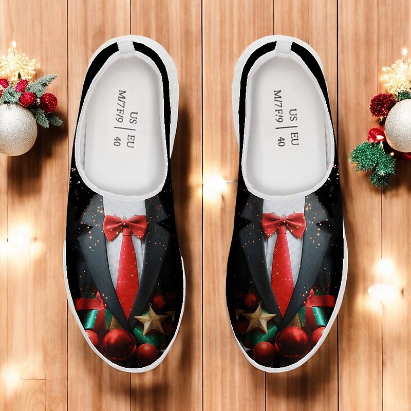 : The shoes boast a vibrant, festive design featuring a striking tuxedo print complete with a bow tie and gold chain embellishments. Additionally, the pattern includes Christmas-themed elements like snowflakes, gift boxes, and a Christmas tree, making them a standout choice for holiday festivities.