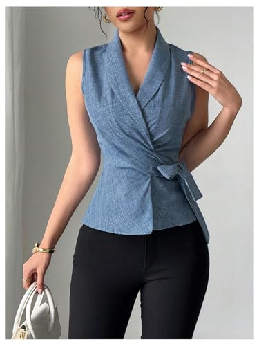 sizzling ! GORGLITTER Women's Denim Bow Wrap Blazer Suit Vest Jeans Collared Shirt Sleeveless Blouses