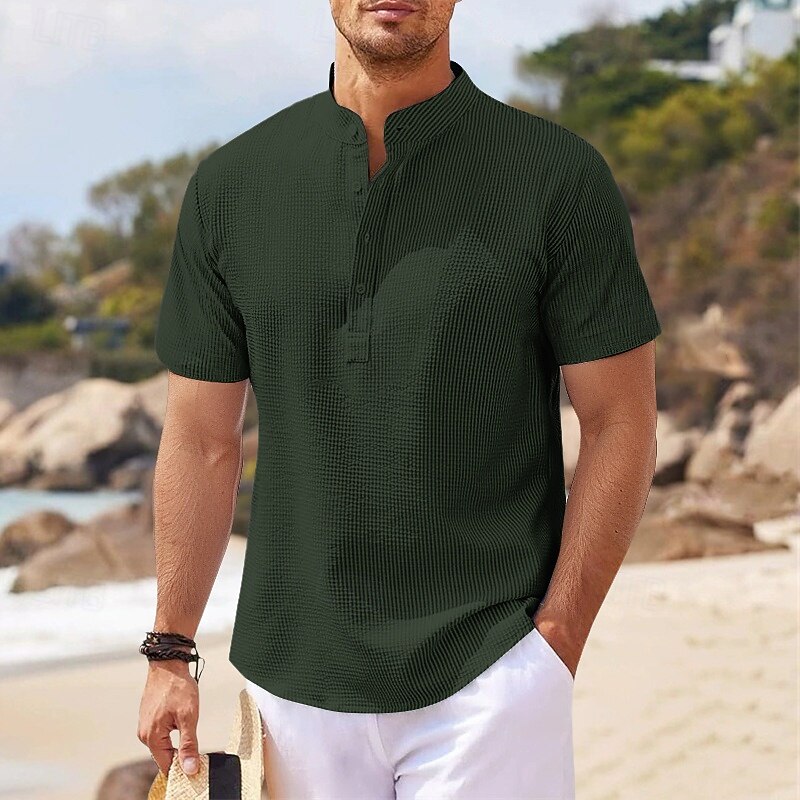 HOT ! Men's Shirt Popover Shirt Summer Shirt Casual Shirt Beach Shirt Waffle Knit Shirt Black White Blue Sky Blue Army Green Long Sleeve Plain Stand Collar Vacation Hawaiian Buttons Clothing Apparel