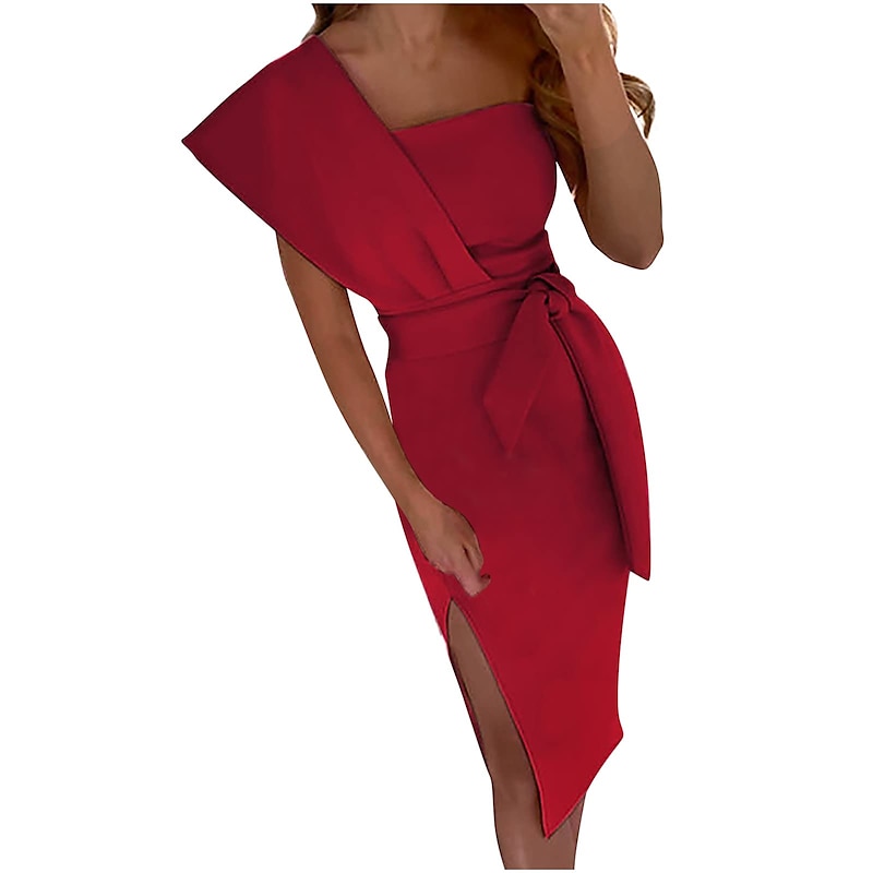 More information about Sheath Cocktail Dresses Elegant Dress Wedding Guest Prom Tea Length Sleeveless One Shoulder Stretch Fabric with Slit Pure Color Strappy Dresses
