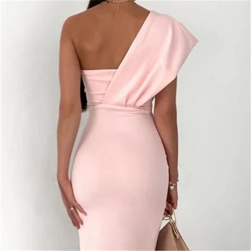 Sheath Cocktail Dresses Elegant Dress Wedding Guest Prom Tea Length Sleeveless One Shoulder Stretch Fabric with Slit Pure Color Strappy Dresses 9