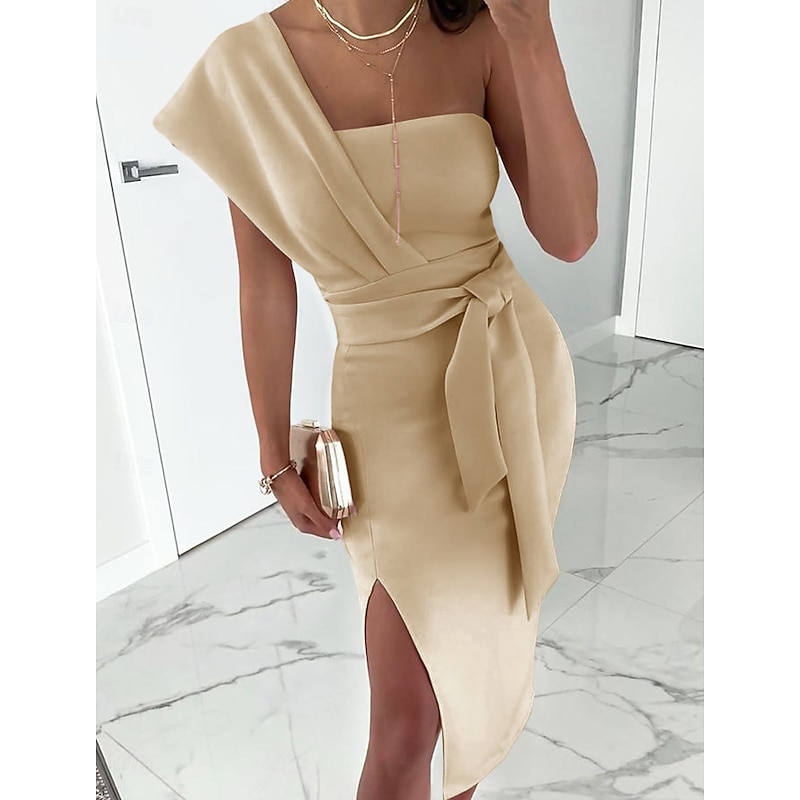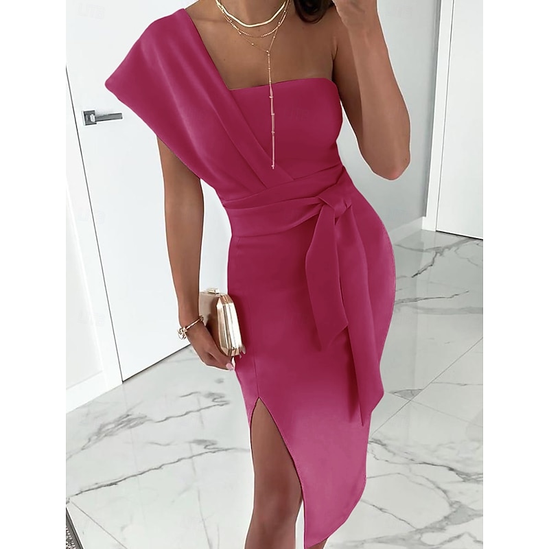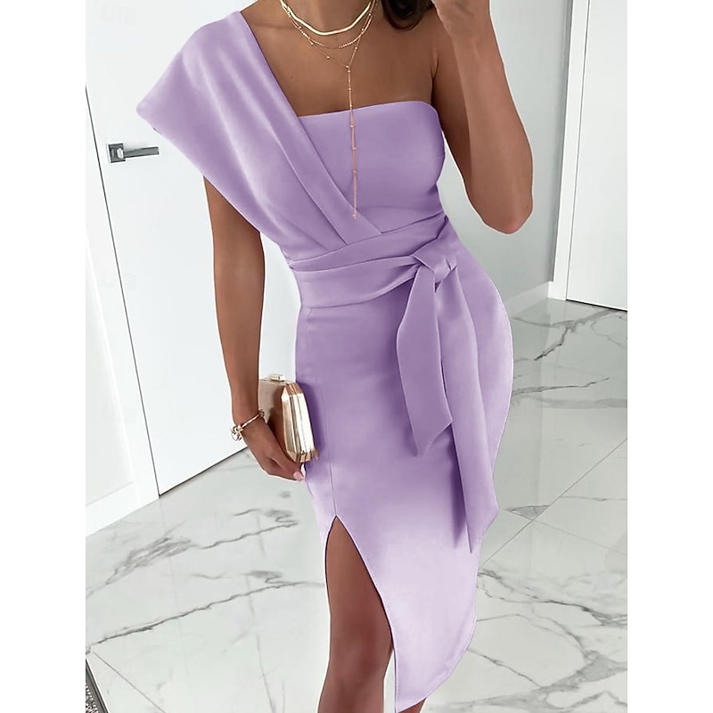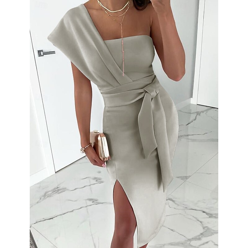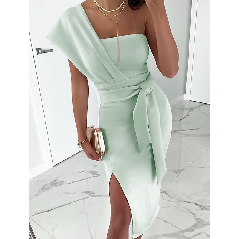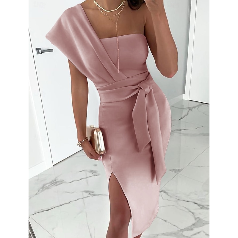 Sheath Cocktail Dresses Elegant Dress Wedding Guest Prom Tea Length Sleeveless One Shoulder Stretch Fabric with Slit Pure Color Strappy Dresses 1