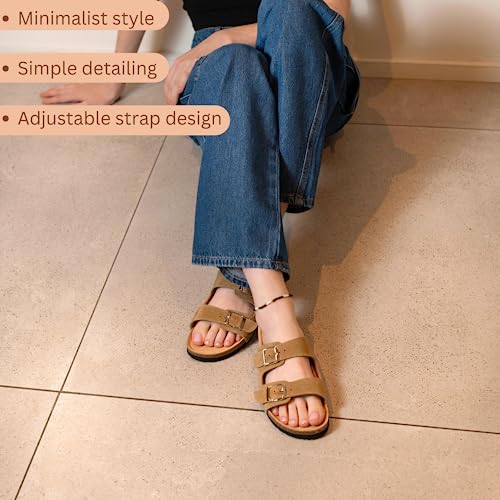 Soft Suede Leather Flat Sandals - Cork Footbed Sandal with Soft Suede Leather - Womens Sandals Comfortable Wear - Comfortable Slip On Cork Footbed Sandals with Adjustable Buckles 5