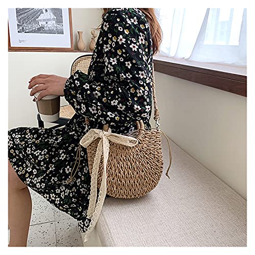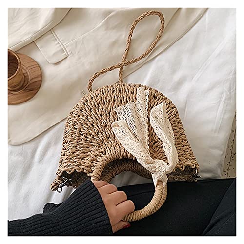 Straw Bag Women Hand-Woven Handbag Moon Shape Lace Bow Rattan Bag Big Capacity Drawstring Casual Beach Shoulder Crossbody Bag (A 19X8.5X23Cm)