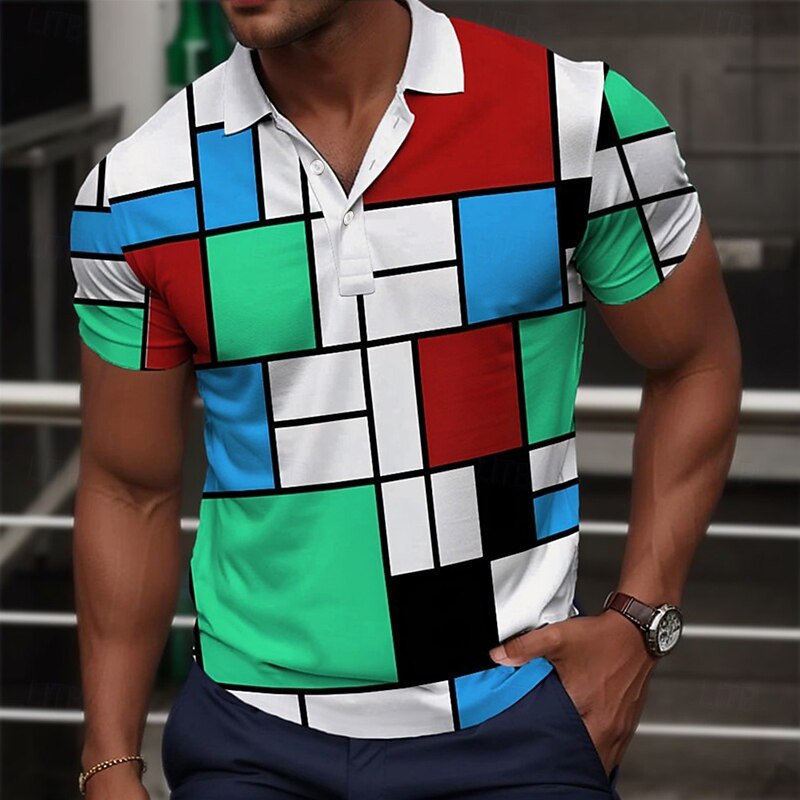 Highlights - Perfect for summer days - Short sleeves for added comfort - Made for men - Versatile polo shirt style - Ideal for vacations - Stylish color block pattern - Eye-catching print design - Classic turndown neckline
