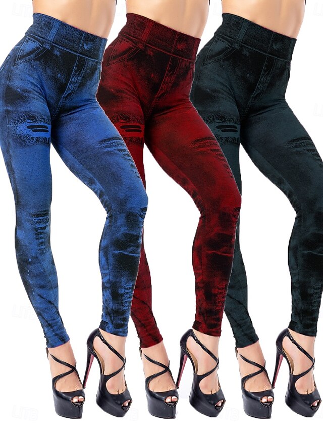 : These leggings feature a faux denim appearance with stylish mock pockets and a faux waistband. The distressed details add an edgy, fashionable touch, while their bold color options make them stand out as a statement piece. They're ideal for pairing with high heels to create a chic, sophisticated look.
