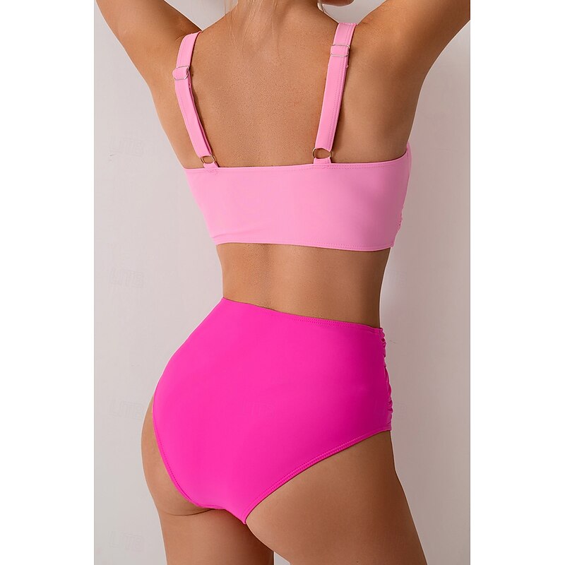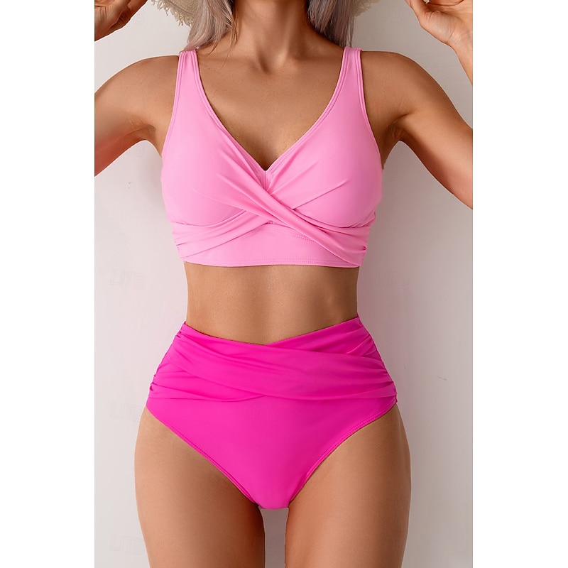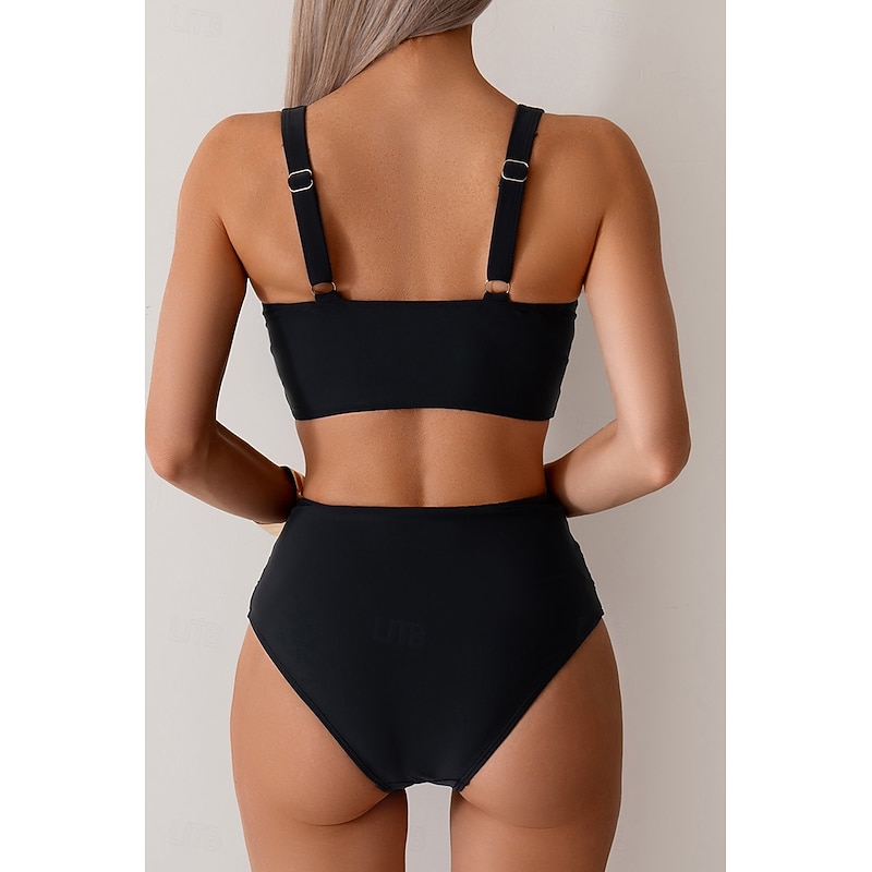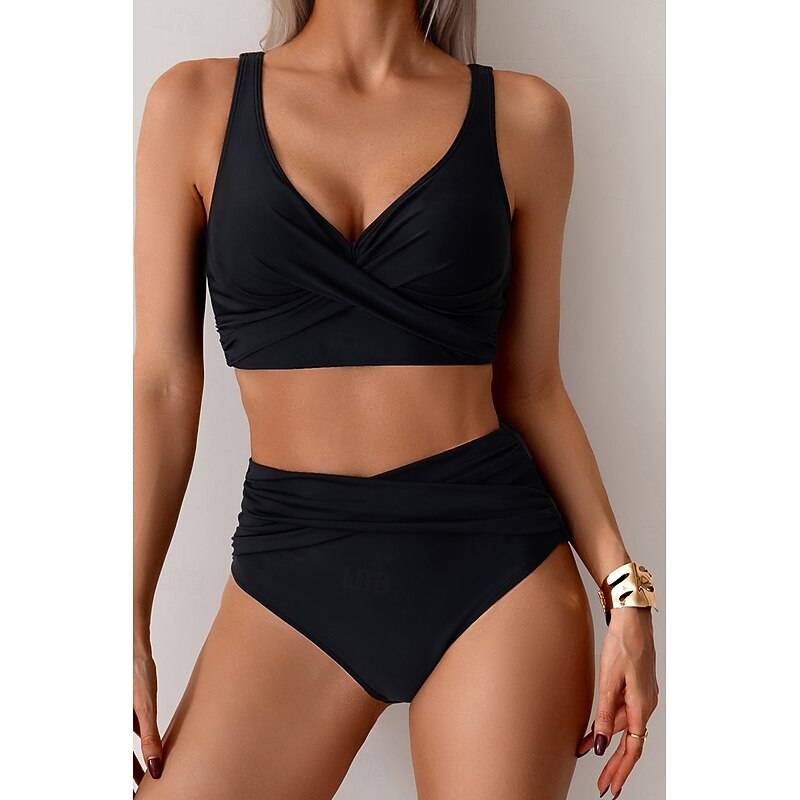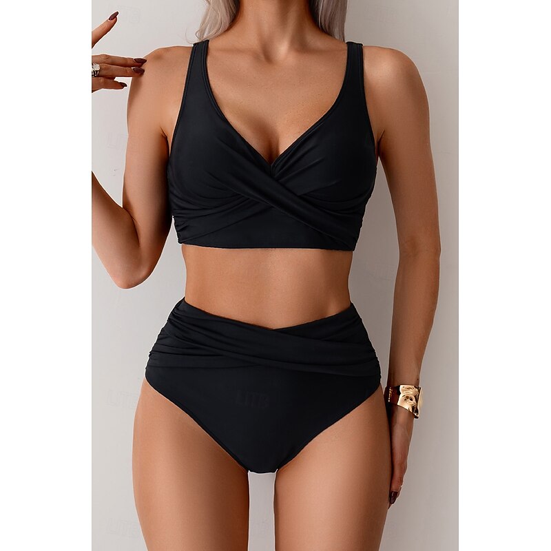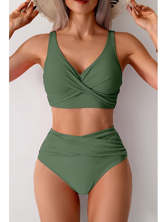 More information about Women's Swimwear Bikini Swimsuit Ruched High Waisted Tropical Beach Wear Plain V Wire Sleeveless Bathing Suits