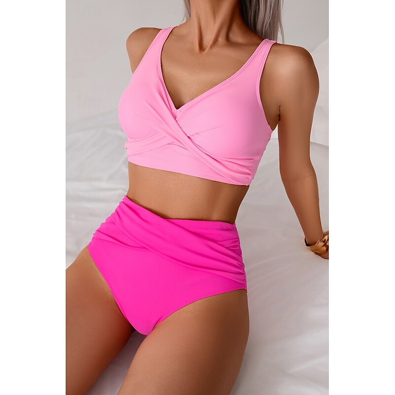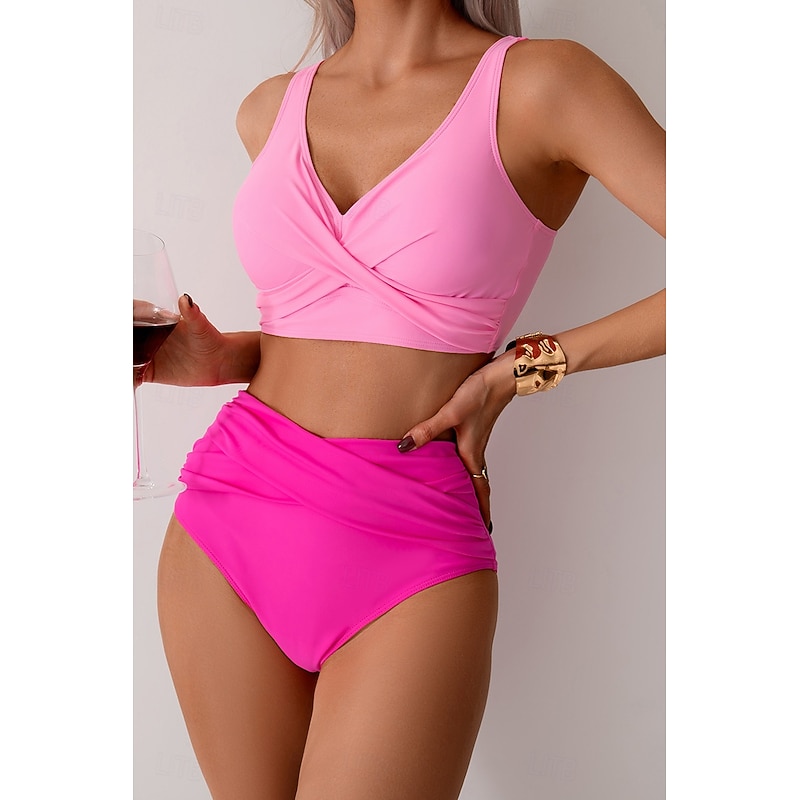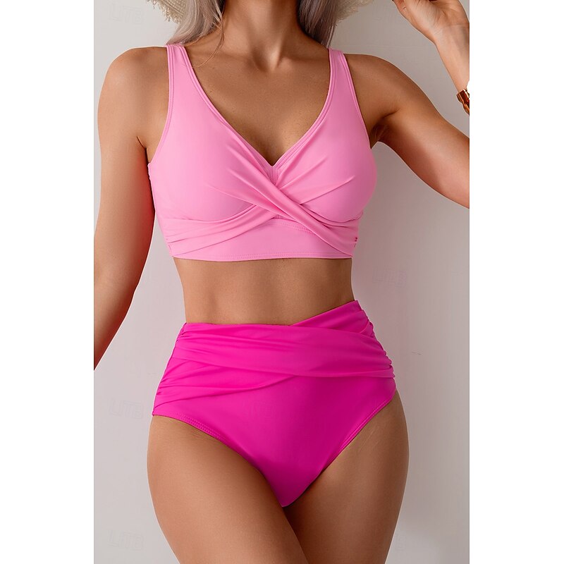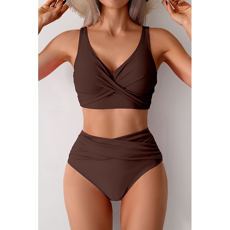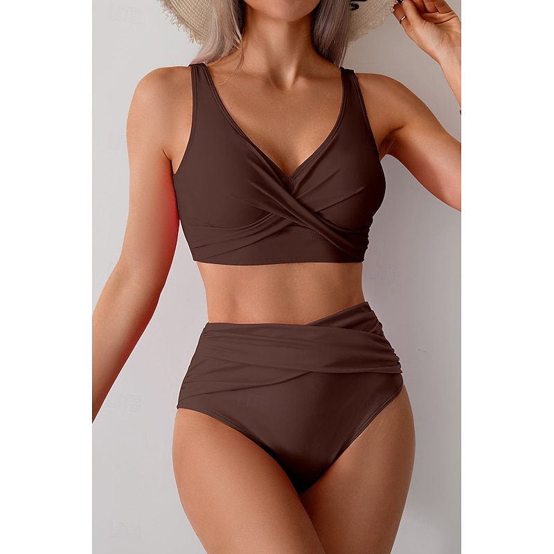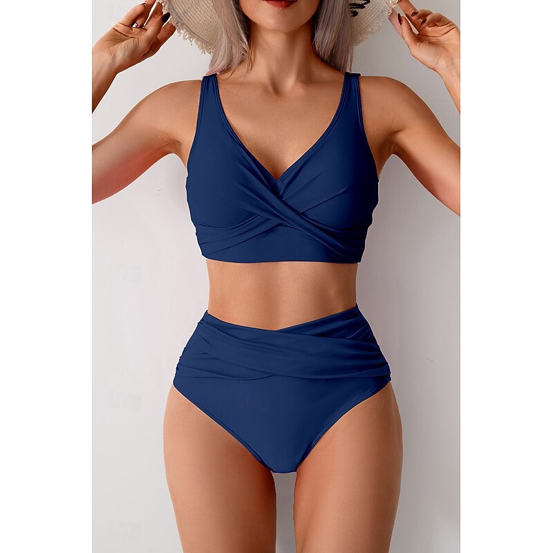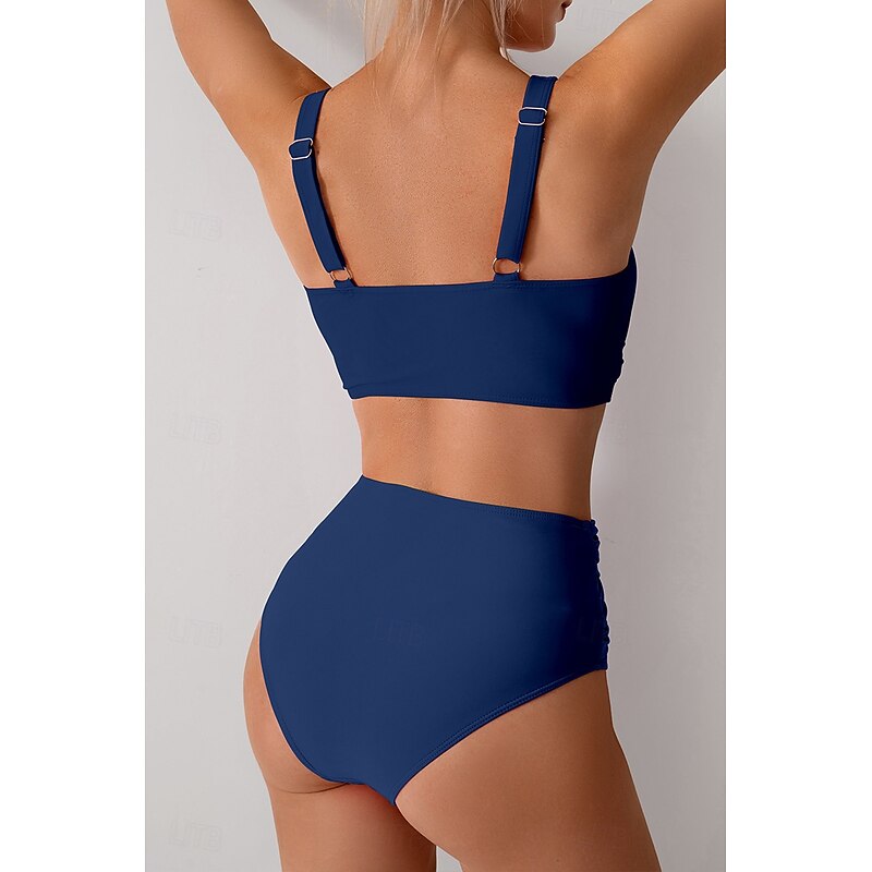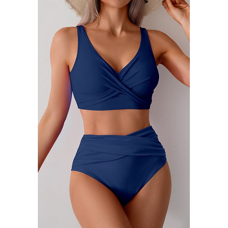 HOT ! Women's Swimwear Bikini Swimsuit Ruched High Waisted Tropical Beach Wear Plain V Wire Sleeveless Bathing Suits
