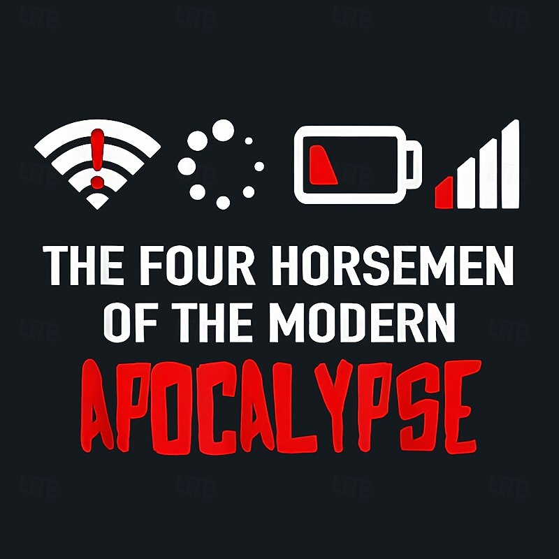 More information about Men's Funny Graphic T-Shirt: Modern Apocalypse Tech Frustrations with Wi-Fi, Low Battery & No Signal Humor Tee