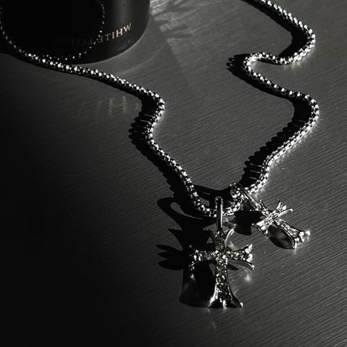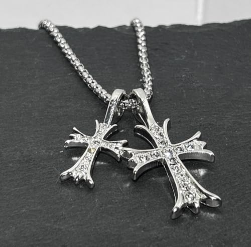 • Y2K Gothic Design : This silver colored double cross necklace features a goth design and consists of a unique thick chunky chain with two different sized cross charm pendants. The cross pendants are set with cubic zirconia, intricate detailing and sparkling zirconia to make them match most clothes