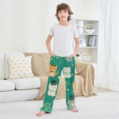 Lucky Clover Cat Boys Long Pants gentle Trousers Elastic Waist Kids Lounge Bottoms with Pockets S-XL