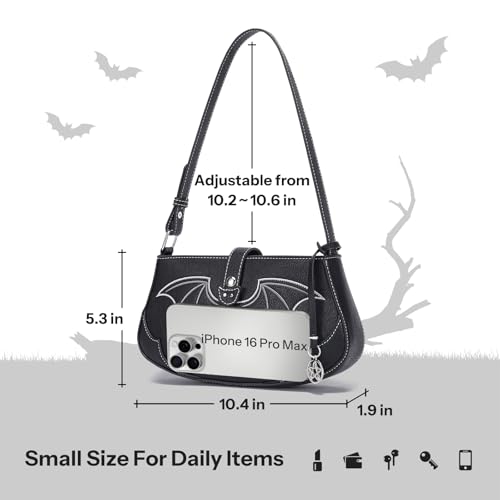 • Adjustable Strap & Bat Head Snap: Shoulder drop: 10.2–10.6 inches with 1-hole adjustability for a comfortable fit. The bat-head-shaped snap closure of this small shoulder purse adds a spooky-cute twist.