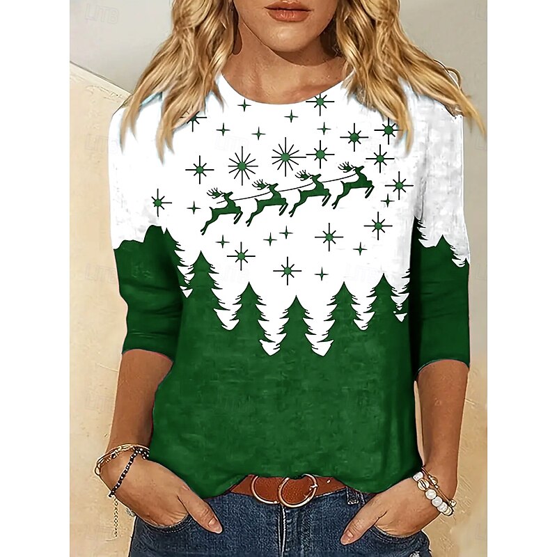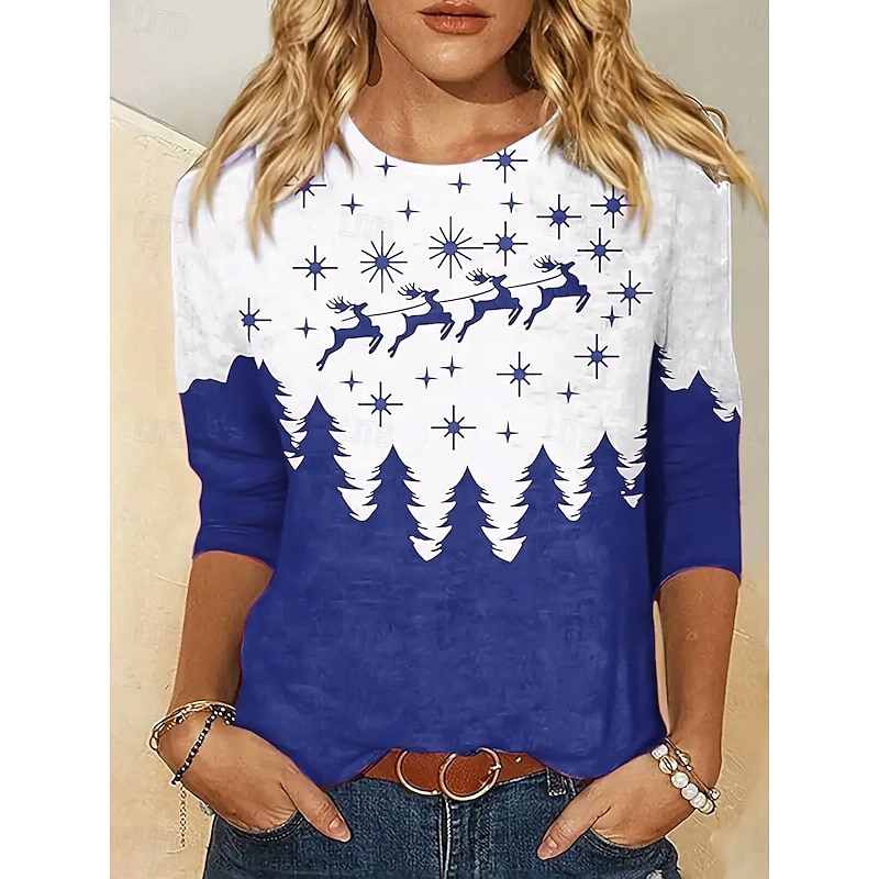 HOT ! Women's T-shirt Reindeer Pine Tree Star Print Long Sleeve Round Neck Red White Casual Festive Holiday Top Clothing Apparel