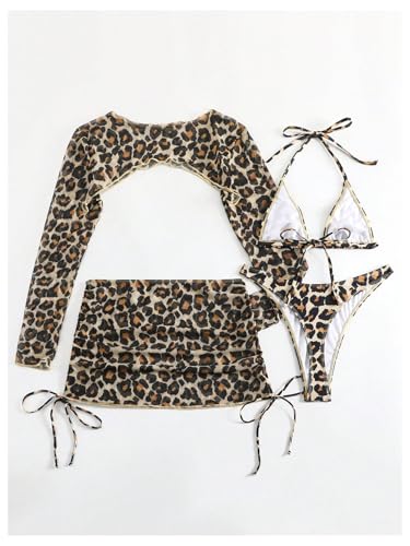 Floerns Women's 4 Piece Bikini Set Leopard Halter Triangle Swimsuit with Cover Up Top and Skirts 6