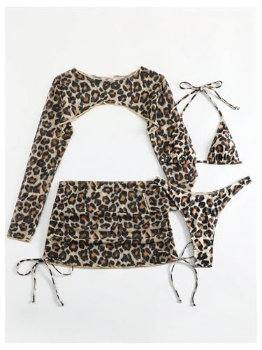 • Feature: Leopard print, sleeveless hater triangle, high cut thongs, long sleeve cover up tops and drawstring beach skirt, 4 piece bikini swimsuit set