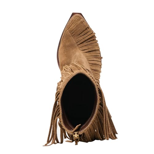 Fringed Ankle Boots Pointed Toe Suede Tassel Short Boots Chunky Heeled Booties for Women 6