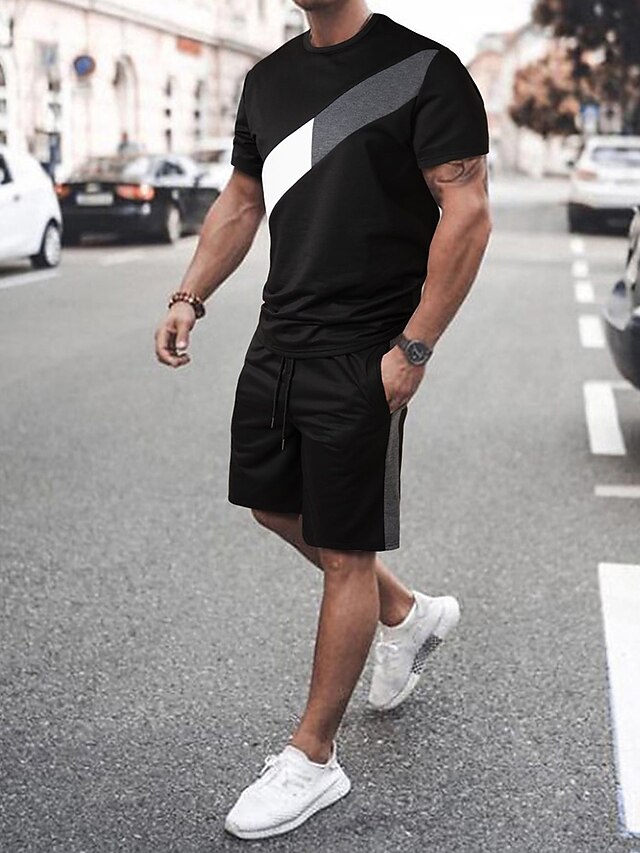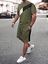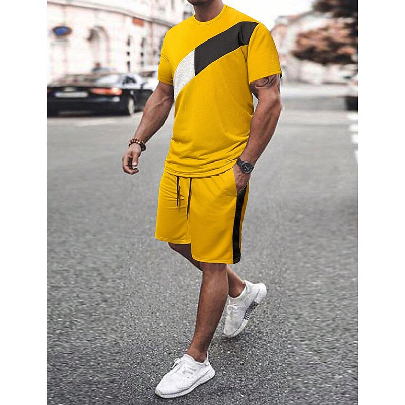 HOT ! Men's 2 Pieces Outfits T-Shirt and Drawstring Shorts Set Short Sleeve Crewneck Summer Color Block Fashion Sport Casual 2 Piece Vacation Casual Daily Wear Black Yellow Green Top Tee for Men