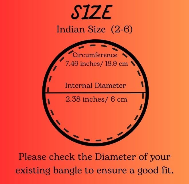 • SIZE : SMALL - S. Indian Size 2-6. Inner Diameter 2.38 Inches Or 6 Cms. PLEASE CHECK SIZE / DIAMETER OF OLD BANGLE (AND COMPARE) BEFORE ORDERING TO AVOID DISAPPOINTMENT.