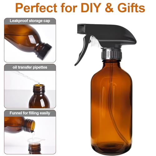 8oz Amber Glass Spray Bottles - 2 Pack Empty Refillable Bottles for Cleaning, Hair Care, Essential Oils, Plants - Includes Durable Nozzle, Labels, Funnel & Dropper, Handheld Size 6