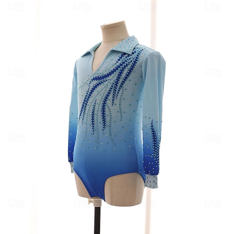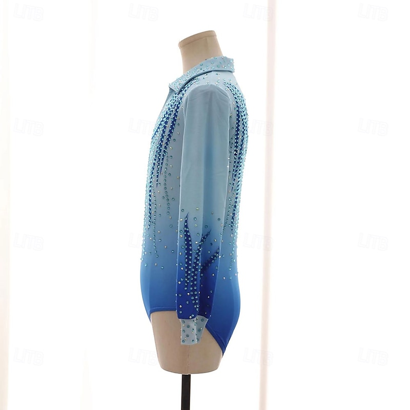 More information about Figure Skating Top Men's Boys' Ice Skating Tops Sky Blue Patchwork Spandex High Elasticity Training Competition Skating Wear iconic Crystal / Rhinestone Long Sleeve Ice Skating Figure Skating