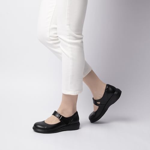 Sole material: PolyurethaneOuter material: Faux LeatherClosure type: Hook & LoopAdjustable fit for Bunions Fitting: True to size for normal/wide feet, 1 size up for bunion/ high arches. Features a 1.2β³ round toe Mary Jane design, vegan PU leather upper, non-removable arch support latex insole, adjustable hook-and-loop ankle strap.CushionUp Technology with Arch Support: Combines memory foam + breathable latex arch support to relieve joint pain, eases plantar fasciitis, prevent overpronation, and ensure all-day comfort during long wear.Comfortable Mary Jane Flats for Professhionals: Sleek, polished design with high quality vegan PU leather upper and padded heel pillow to prevent blisters. Ideal for flight attendants, nurses, teachers, waitresses or dress codes requiring closed-toe work shoes.Adjustable Hook-and-Loop Closure: Customize fit for loose or tight preferences. Slip-on ease meets secure wear, perfect for travel or busy lifestyles.Dessy & Versatile Style: Pairs with work uniforms, dresses, jeans, or travel outfits. Vegan-friendly and designed to last through seasons- your go-to flat shoes for weddings, airports, or errands. Perfect for everyday use. High quality materials and excellent craftsmanship ensure long-lasting durability.