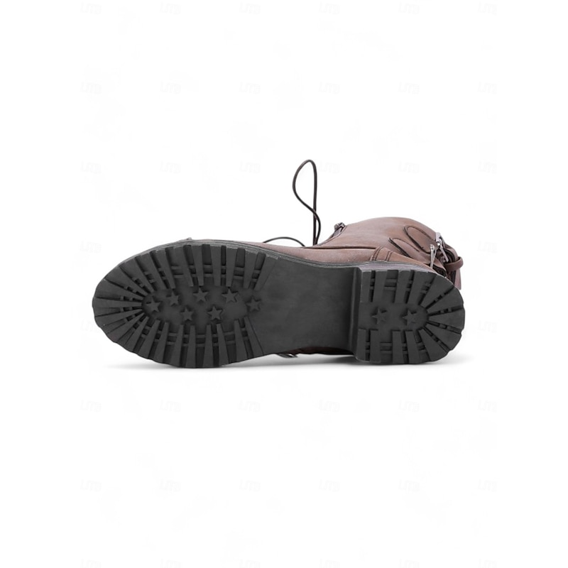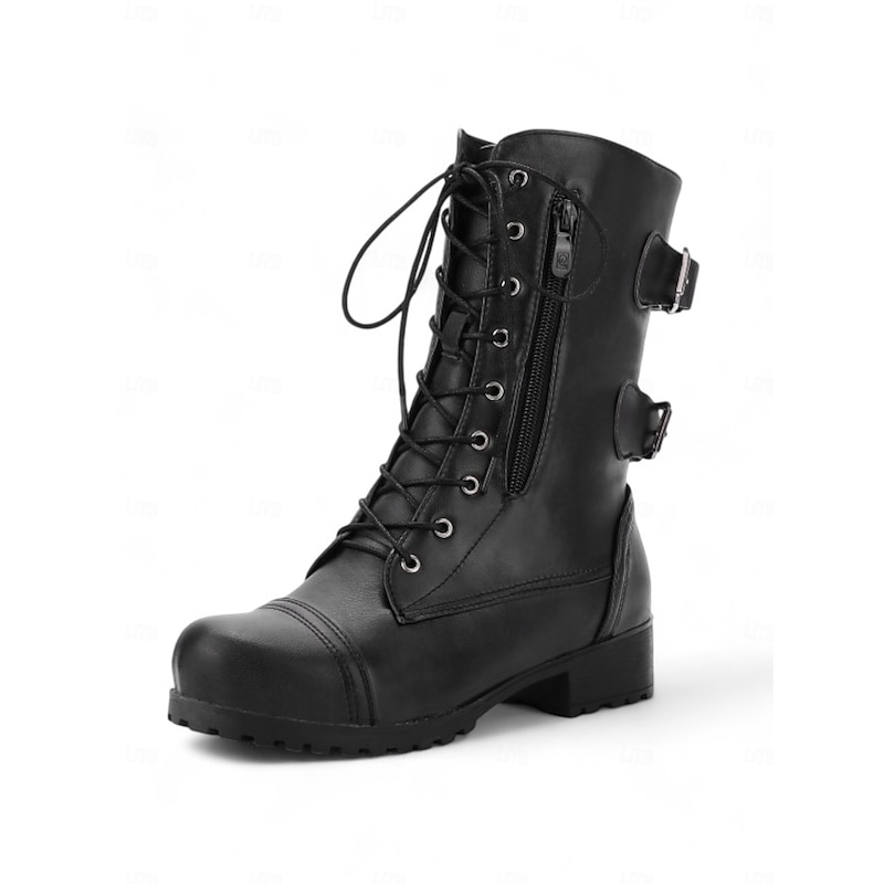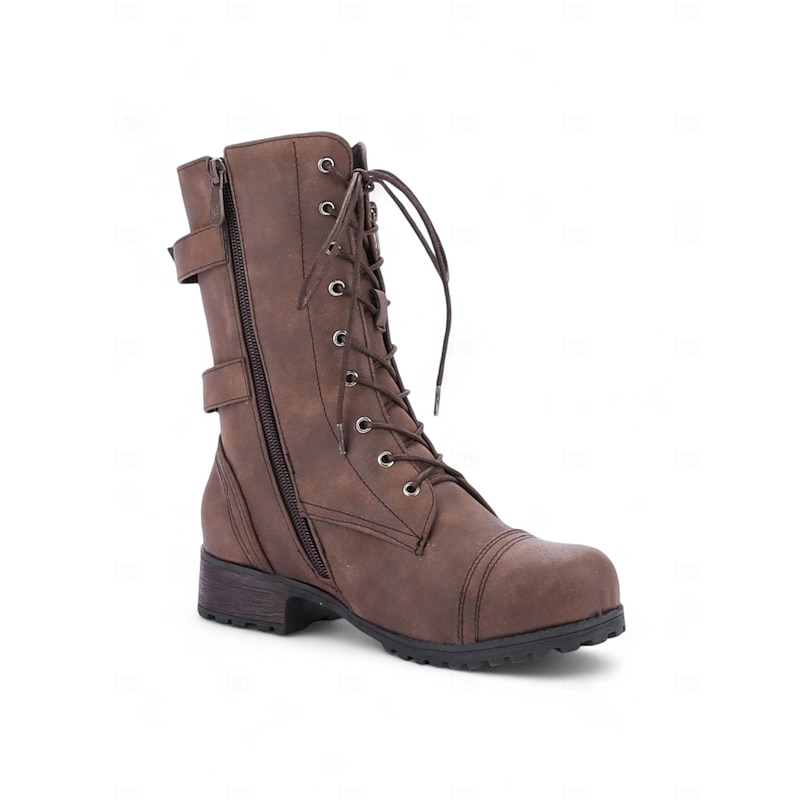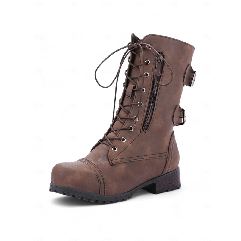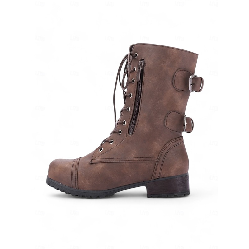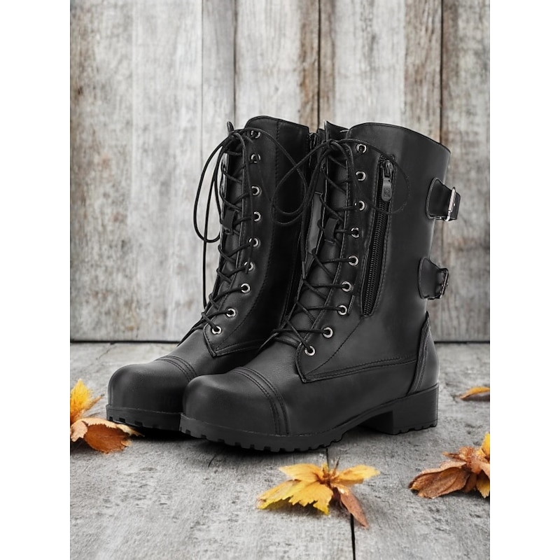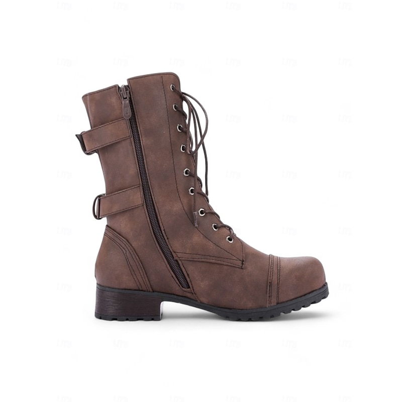 Highlights [Material] : These versatile women's boots are crafted from premium faux leather, ensuring durability and a rugged yet stylish appearance perfect for fall and winter. [Style] : Featuring a classic combat boot design, these mid-calf boots offer both comfort and protection. The low heel adds stability, making them ideal for everyday wear. [Design Highlights] : The boots boast a lace-up front complemented by a functional side zipper for easy wearing. Decorative buckles add a touch of edginess, while the round toe and vintage, casual style make them a versatile addition to any wardrobe. The thick, textured rubber soles provide excellent traction on various surfaces. [Occasions] : Perfect for daily use, these boots add a fashionable, yet practical element to any outfit. They are ideal for women seeking to combine functionality with a trendy, military-inspired flair. [Size Range] : Available in a variety of sizes, these boots accommodate a range of foot measurements to ensure a comfortable fit; US5.5 to US10.5, fitting EU sizes 35 to 42 and UK sizes 3.5 to 8.5.