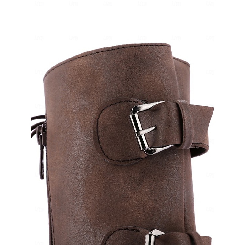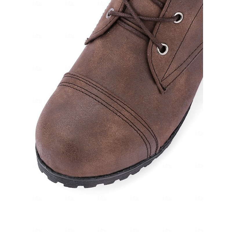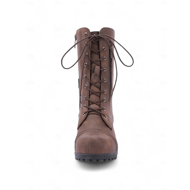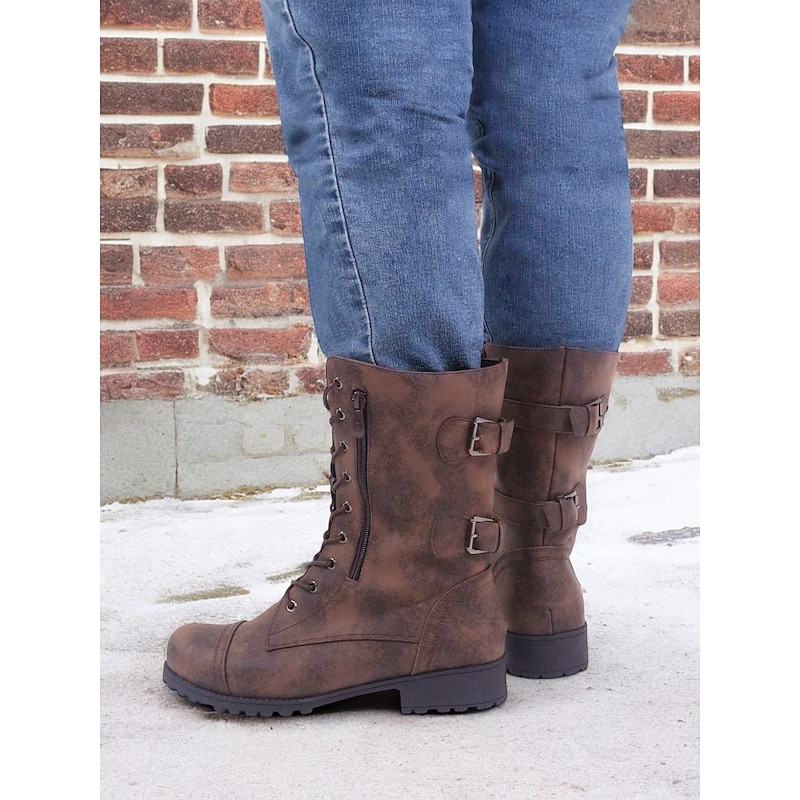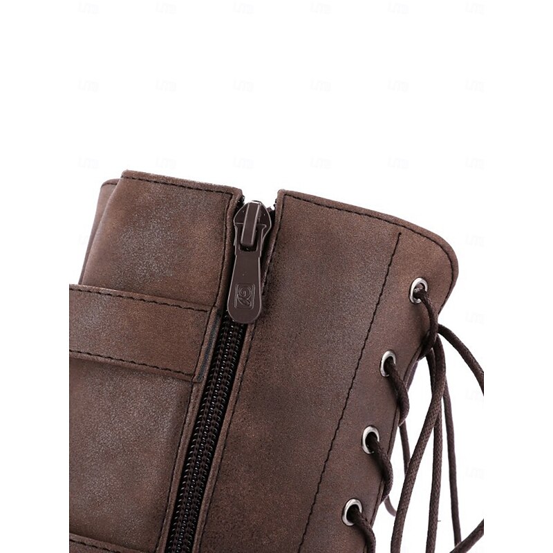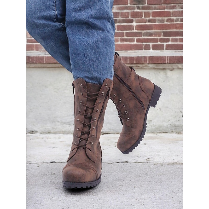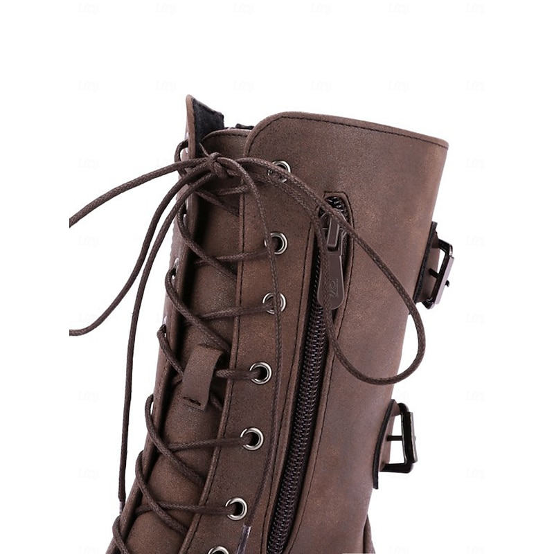 Highlights [Material] : These versatile women's boots are crafted from premium faux leather, ensuring durability and a rugged yet stylish appearance perfect for fall and winter. [Style] : Featuring a classic combat boot design, these mid-calf boots offer both comfort and protection. The low heel adds stability, making them ideal for everyday wear. [Design Highlights] : The boots boast a lace-up front complemented by a functional side zipper for easy wearing. Decorative buckles add a touch of edginess, while the round toe and vintage, casual style make them a versatile addition to any wardrobe. The thick, textured rubber soles provide excellent traction on various surfaces. [Occasions] : Perfect for daily use, these boots add a fashionable, yet practical element to any outfit. They are ideal for women seeking to combine functionality with a trendy, military-inspired flair. [Size Range] : Available in a variety of sizes, these boots accommodate a range of foot measurements to ensure a comfortable fit; US5.5 to US10.5, fitting EU sizes 35 to 42 and UK sizes 3.5 to 8.5.