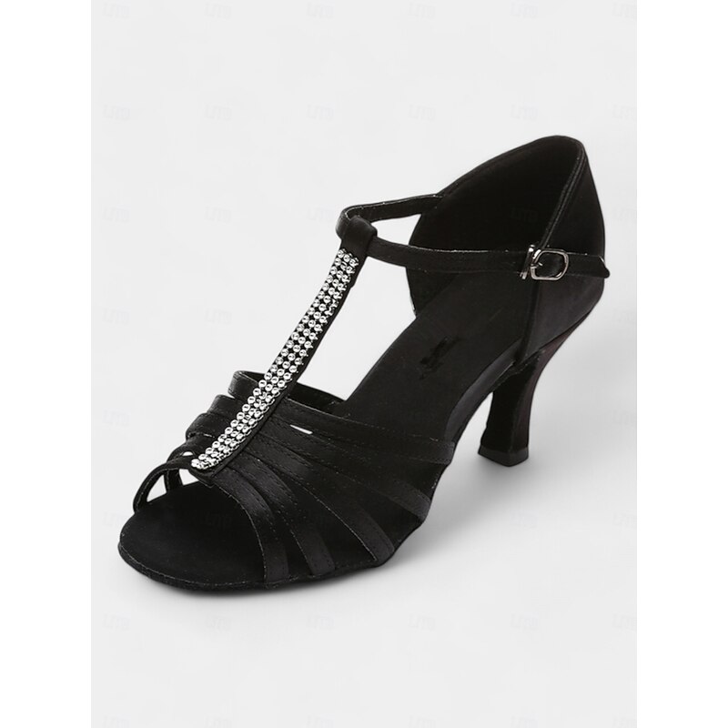 Women's Latin Dance Shoes with Rhinestone T-Strap and gentle Suede Sole | Satin Open-Toe Kitten Heels for Ballroom and Salsa