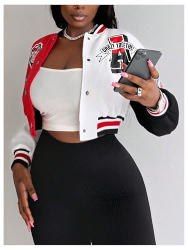 • Features: Womens crop varsity jacket, baseball collar, drop shoulder, graphic pattern, button front, long sleeve, loose fit, edgy and youthful street style, fashionable