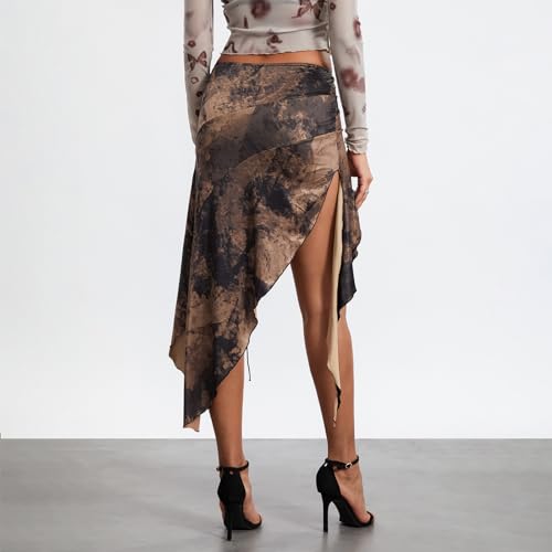 HOT ! Women's Midi Skirt Low Waist High Split Vintage Pattern Print Front Tie Up Irregular Ruffle Hem Skirt Clubwear